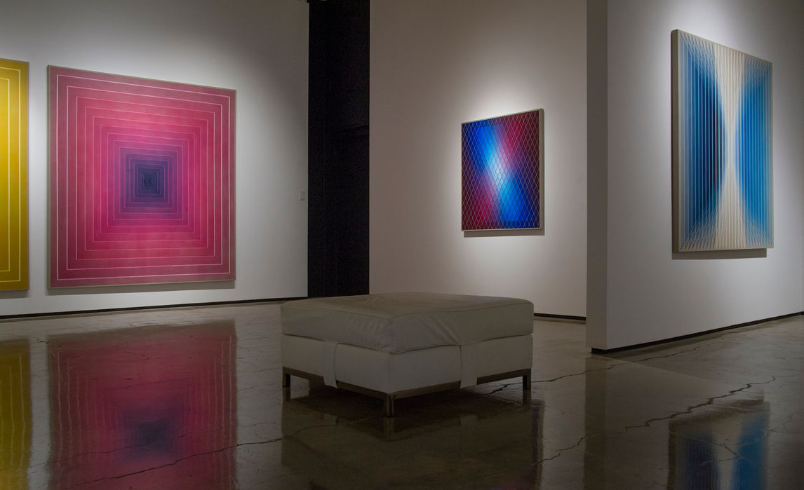 Some of Mullen’s paintings are an exploration of his wife, filmmaker Lucy Cordes Engelman’s gift of conjoined sensory illusion called Synesthesia. By blending colour relationships with lines, Daniel Mullen arouses the viewer’s perception of space by employing an abstract language of lines and geometric shapes to create optical phenomena that appears kinetic or three-dimensional, these layered images of shapes appear to be either protruding or receding from an illusionary space. His works convey a kinetic energy that engages our eyes with the dynamism of his works, while bringing a tempered sense of structure and balance.